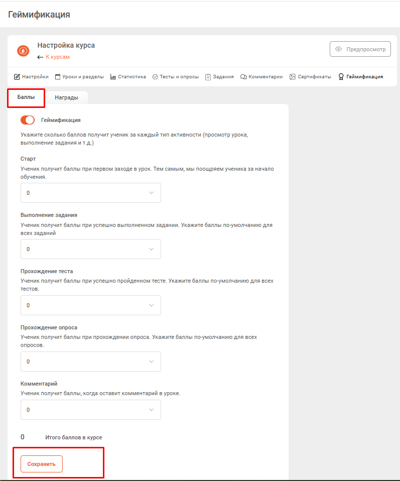 Включите Геймификацию в разделе Баллы и выберите кол-во баллов, которые наберет ученика при выыполнении перечисленных в разделе действий, нажмите кнопку Сохранить