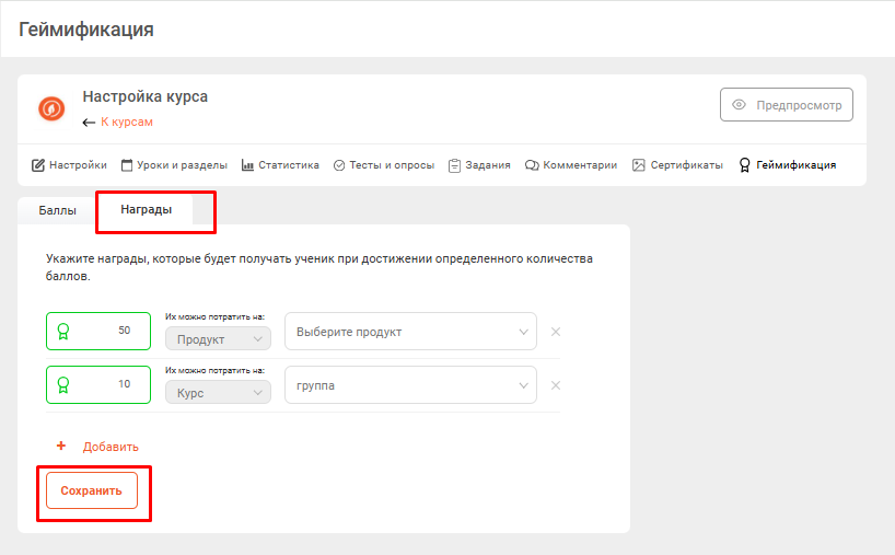 В разделе Награды выберите Продукты иди Курсы, которые ученик получит при наборе того или иного кол-ва баллов и Сохраните изменения