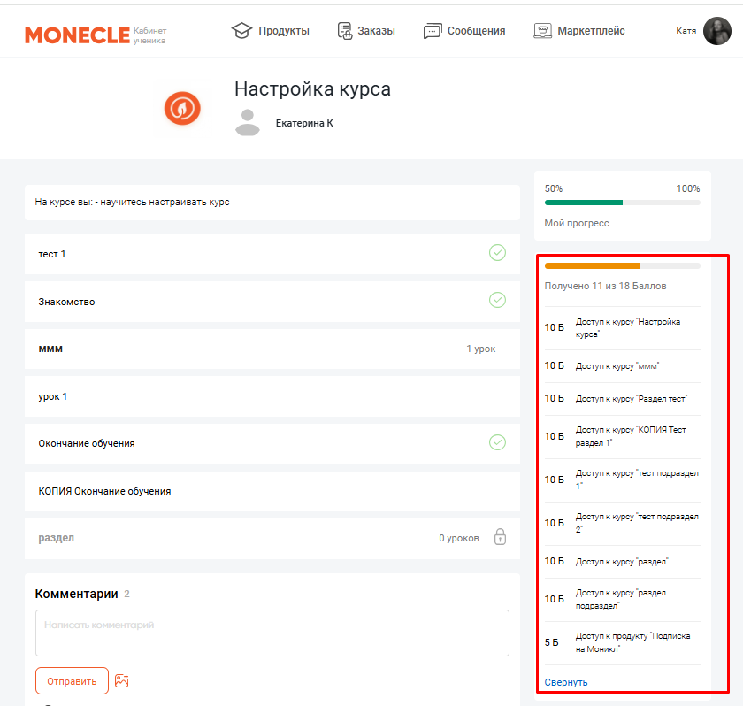 Как только учени наберет необходимое кол-во баллов для той или иной награды - продукт или курс появлятся у него в лк
